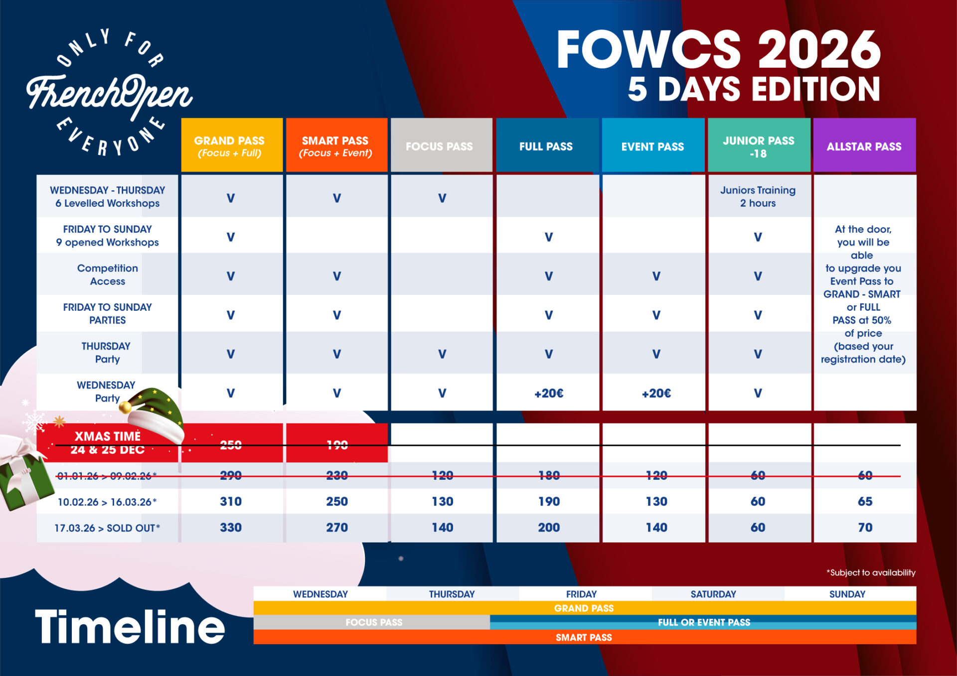Les danseurs de catégorie CHAMPION seront invités au FOWCS ! Pour obtenir votre EVENT Pass, vous devrez nous écrire à fowcs.info@gmail.com.